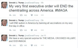 Trump also tweeted, “I will END autism in America by banning all vaccinations on my very first day in office.” The other day Trump’s transition team tapped famous anti-vaxxer Dr. Oz for Surgeon General.