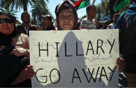 Thousands of anti-American Tunisian protesters chanted “No to the American tutelage over Muslim lands” and (يا للعار يا للعار, بعد الثورة إستعمار) “Ya lil Aar ya lil A’ar ba’s el-Thawrah el-Istimar” (What a shame, What a shame – after the revolution comes colonialism). The protesters waved black flags and raised banners with English phrases such as “Hillary Erhali – Hillary go away”. They also raised a sign in French: “Degage” – (Go away) which was turned into a symbol of their revolution and chanted loudly in front of the Red Cross while Clinton was there.
