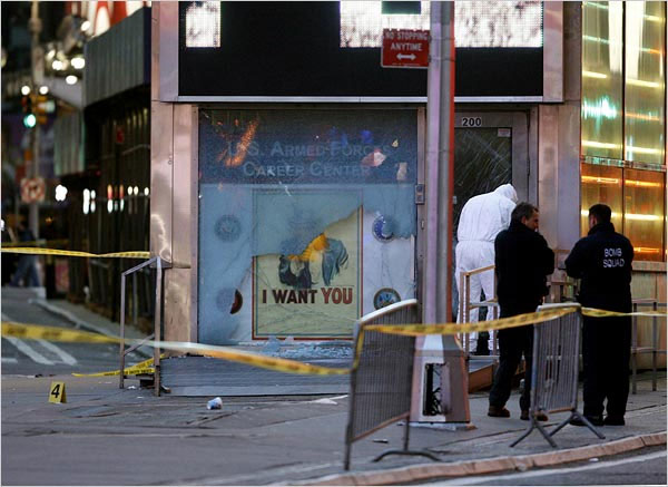 Photo: Police officers, one of them in a hazardous-materials suit, examined the military recruiting station in Times Square after a small explosion damaged the front of the building early Thursday morning.