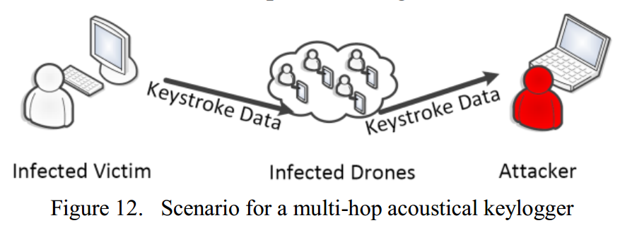 In a scenario based hacking, “The infected victim sends all recorded keystrokes to the covert acoustical mesh network. Infected drones forward the keystroke information inside the covert network till the attacker is reached, who is now able to read the current keyboard input of the infected victim from a distant place.” paper explained.