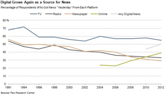 These surveys seem to contribute to the increasing trend of people turning to the Internet for their news. Pew Research’s State of the Media study for 2013 showed that online news is the only growing sector in the news industry.