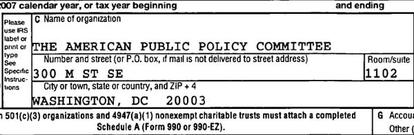 According to IRS records, the American Public Policy Committee is located at 300 M Street SE, Suite 1102, Washington, D.C., 20003. |