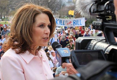 Rep. Michele Bachmann speaks to PJTV during protest against Obamacare at Capitol on March 21 (photo: Flickr, theqspeaks) |
