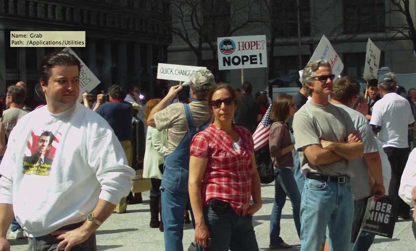 The ethnic and racial makeup of the Tea Party rally was predominantly white. Many of the people were middle-aged. There were a few hundred people dressed in work clothes who presumably work for small businesses or downtown firms in Chicago, a group of twenty Log Cabin Republicans with rainbow colored flags, and around thirty or forty people in camouflage carrying flags that read "Don't Tread on Me."