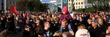 Dori Sigurdsson, an Icelandic blogger, reports that when Parliament returned from recess on October 1st, they were met by a loud, angry crowd who tossed eggs, bread, dairy products and keys at them. People slept outside the Parliament building the night before its return session. He’s posted videos and several images.